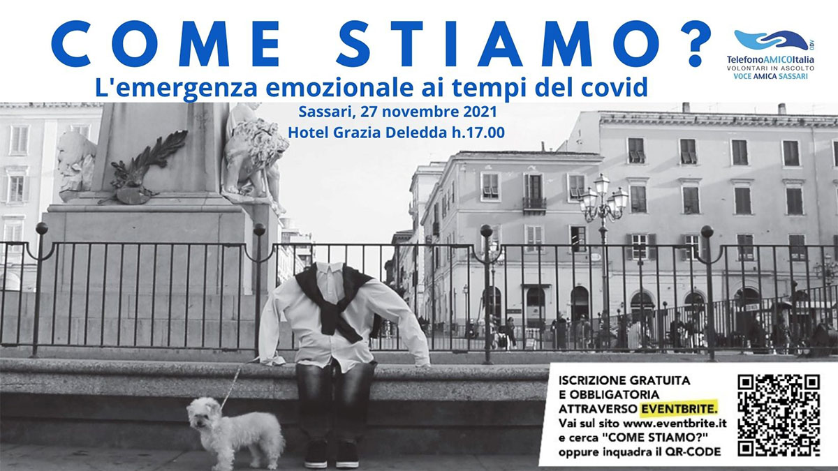 Sabato 27 novembre 2021, dalle ore 17, presso la sala congressi dell’Hotel Grazia Deledda di Sassari, il convegno “Come stiamo? L’emergenza emozionale ai tempi del covid”, organizzato da Voce Amica Sassari ODV con il patrocinio del Comune di Sassari, che vuole essere un’occasione per rivolgere lo sguardo su realtà diverse ma coinvolte da un comune denominatore che ha cambiato improvvisamente la vita di ognuno di noi.