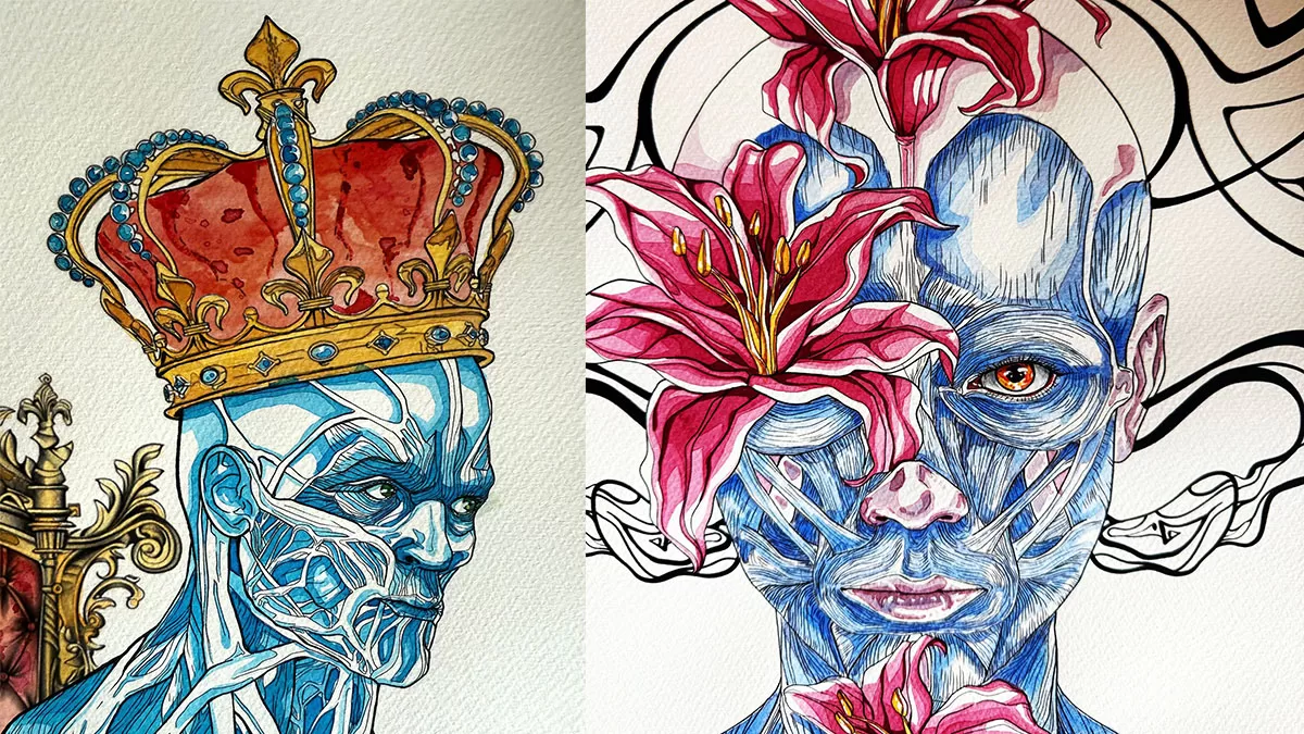 La rassegna propone una raccolta di illustrazioni realizzate in tecnica mista, in cui l’artista esplora un linguaggio visivo in bilico tra realismo e dimensione onirica. L’opera di Davide Gratziu si fonda su una tecnica precisa e dettagliata, che permette di rendere plausibili visioni immaginarie e suggestioni visionarie. I colori intensi e la cura dei dettagli costruiscono un percorso visivo che intreccia anatomia, natura e mito. Muscoli che si trasformano in radici, fiori che emergono dalla carne e simboli antichi dialogano con la fragilità umana, restituendo immagini che combinano realtà concreta e dimensione fantastica.