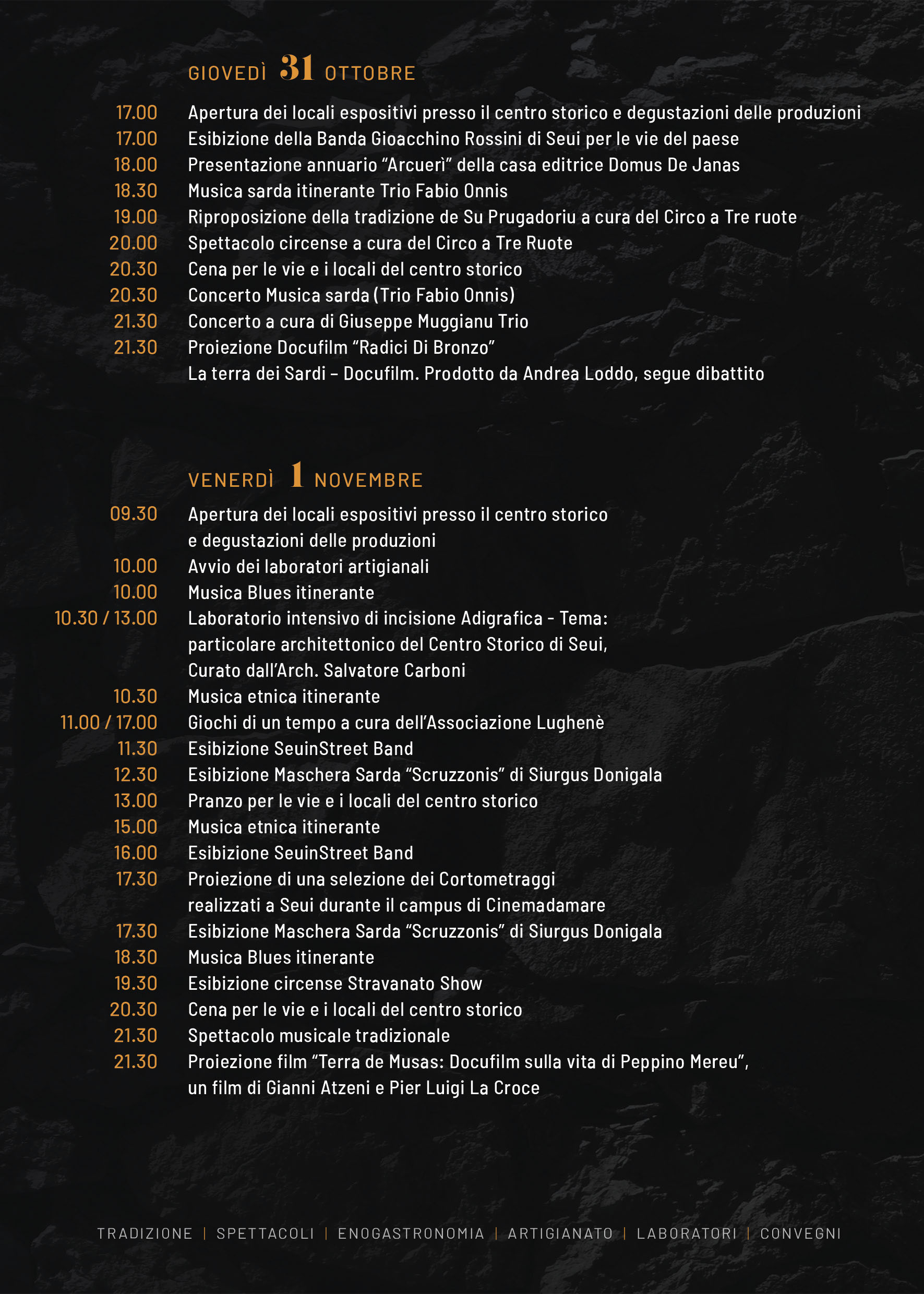 L’ampio programma coniuga come sempre tradizioni, cultura, gusto e divertimento, articolandosi in quattro intensi giorni. Si parte giovedì 31 ottobre: alle 17 aprono locali espositivi nel centro storico e iniziano le degustazioni dei prodotti locali. Si prosegue con esibizioni musicali itineranti e con la riproposizione della tradizione de Su Prugadoriu. In serata, cena per le vie del centro storico, spettacoli e musica dal vivo.
