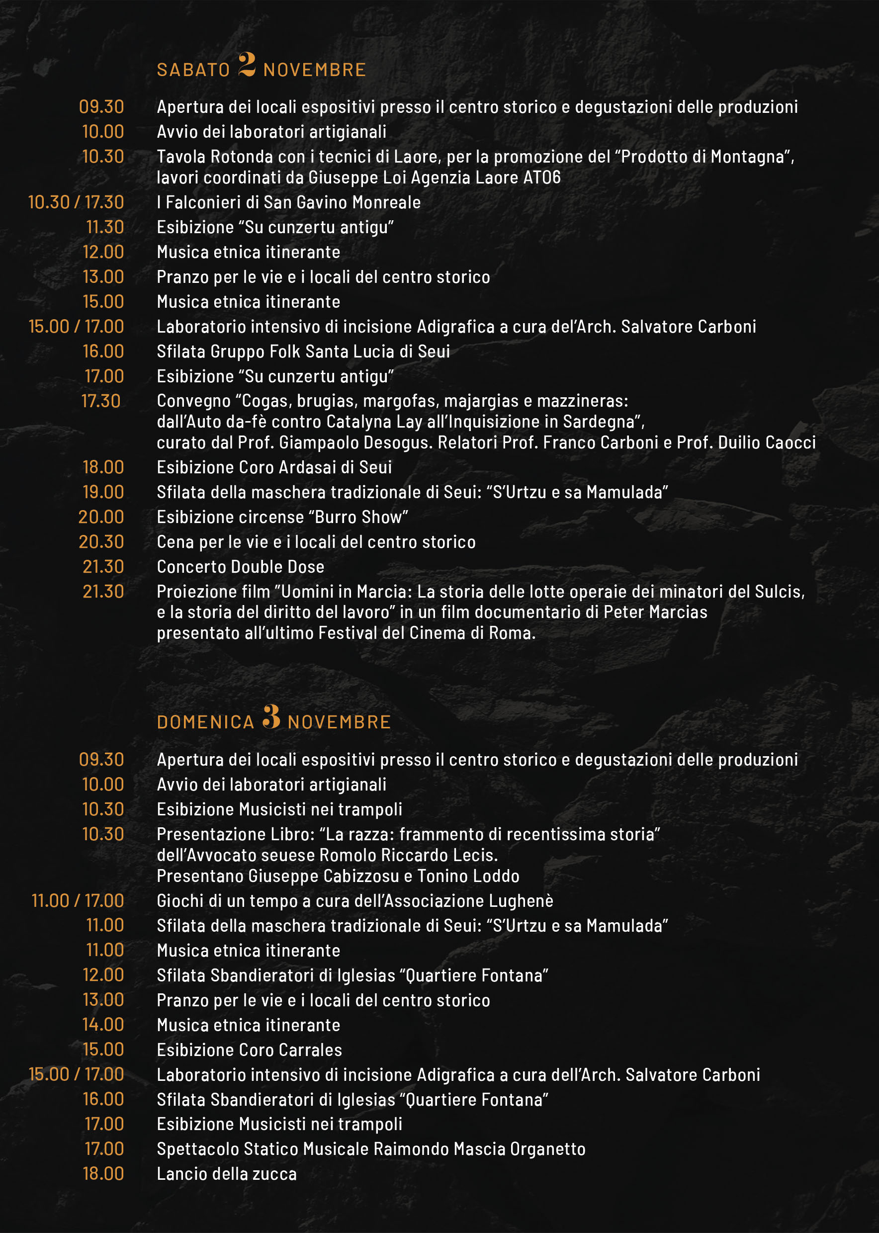Venerdì 1° novembre si riparte alle 9:30 con esposizioni e laboratori artigianali. Nel corso della giornata sono in programma giochi, esibizioni musicali e di maschere tradizionali, pranzo e cena nelle strade e proiezioni di film. Sabato 2 novembre si caratterizza per l’esibizione dei Falconieri di San Gavino, per le sfilate di gruppi folk e della maschera tradizionale S’Urtzu e sa Mamulada e per un convegno sull’Inquisizione in Sardegna, oltre alle consuete esposizioni ed esibizioni musicali. Domenica 3 novembre – tra giochi, laboratori, musica e buon cibo -, sfilano gli Sbandieratori di Iglesias e si svolge il Lancio della zucca.
