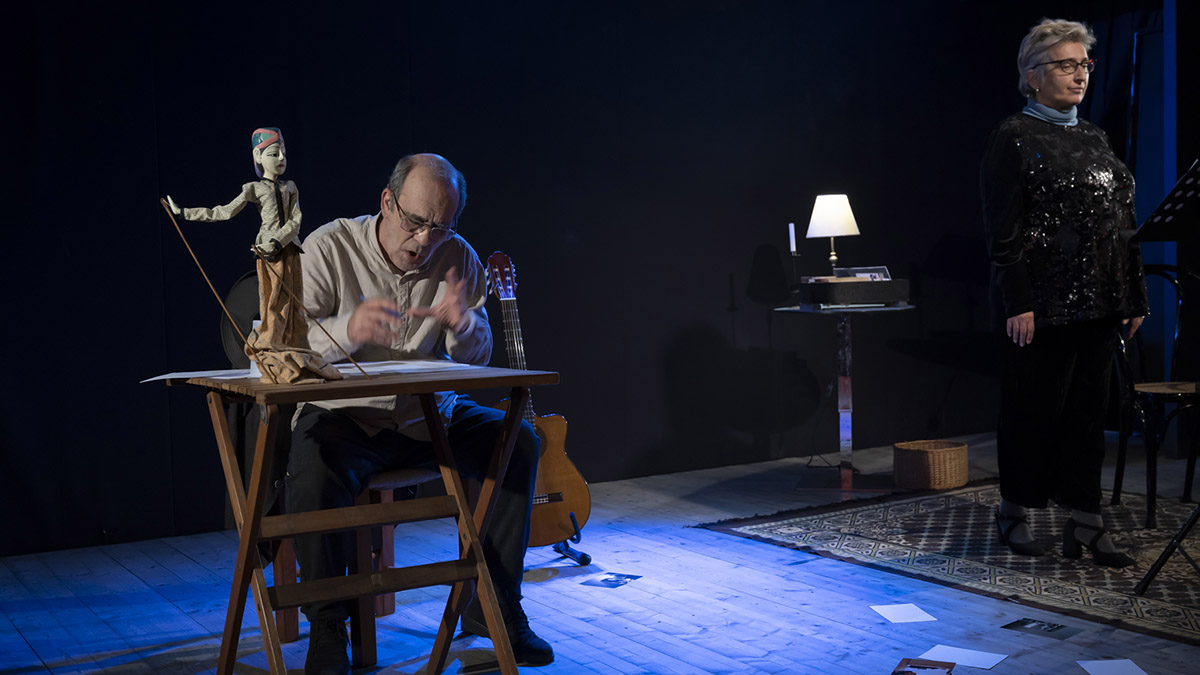 I due attori-poeti condividono uno spazio scenico diviso in due, separato a metà da un’invisibile barriera che relega ognuno dei due nel suo piccolo mondo domestico, nella propria solitudine. I poeti, però, conoscono da tutta la vita quella condizione di isolamento, che tutti noi abbiamo scoperto nel periodo del lockdown, vivendola come condizione necessaria per la loro stessa esistenza.