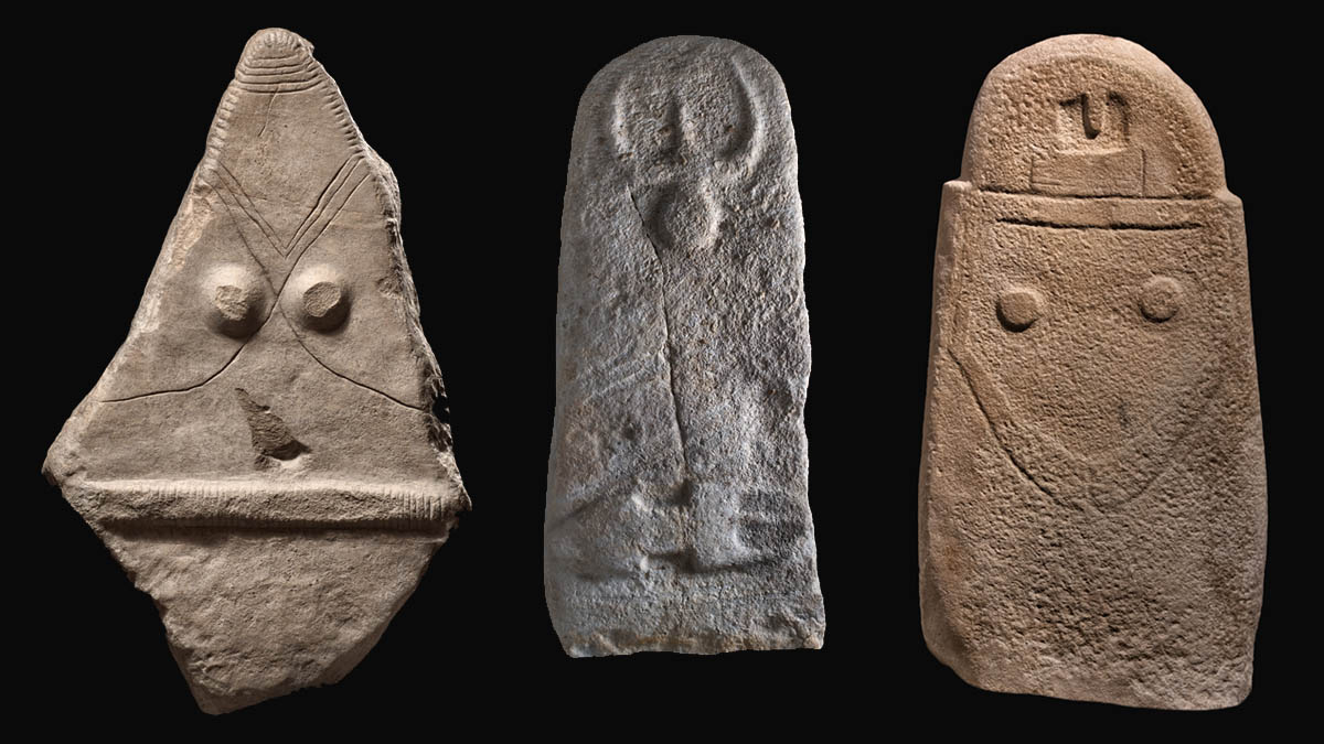 Da sx le immagini delle pietre preistoriche di Bovino (Museo Civico Carlo Gaetano Nicastro), (Nurallao Museo Sanna Sassari), La Spezia (Museo Archeologico Castello San Giorgio). ? Nicola Castangia