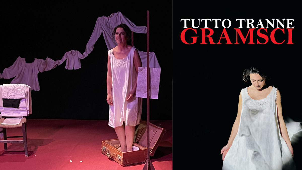 Tra le fatiche dell’infanzia e le inquietudini della maturità, in particolare durante la prigionia del fratello, Teresina rivive le atmosfere domestiche, la relativa serenità e armonia ma anche l’allegria dei giochi e l’antica vivacità di una famiglia numerosa, in cui pur senza volerlo, quasi con naturalezza, il piccolo Antonio, diventato ragazzo e poi uomo, rappresentava il fulcro dapprima con le sue imprese scolastiche e le sue scorribande intellettuali, poi con il prestigio internazionale e la dura repressione in patria, fino all’assurda condanna e alla tardiva liberazione. Nella pièce si intrecciano parole e visioni, con una scrittura scenica suggestiva in cui prende forma l’ambiente familiare della casa, tra i piccoli riti quotidiani e la semplicità dei gesti che scandiscono le giornate: “Tutto Tranne Gramsci” mette in luce il ruolo delle donne nella vita del protagonista, grande assente ma in realtà figura centrale della narrazione. Nella giovinezza la madre e le sorelle, poi la moglie, Giulia Schucht e la cognata Tatiana, che gli sarà vicina negli anni del carcere: un universo femminile che ha rappresentato nei momenti cruciali dell’esistenza un solido punto di riferimento, la sfera degli affetti, preziosi, da custodire, il legame con le radici e la terra d’origine e l’amore per una donna, poi madre dei suoi figli, accanto alla passione politica, alla volontà di cambiare il mondo partendo dai principi marxisti e dalla lotta di classe, per costruire una nuova civiltà fondata sui principi di giustizia e eguaglianza, in una magnifica e realizzabile utopia.