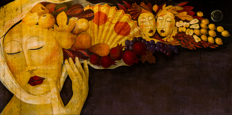 La figura femminile primeggia: una donna, non più simbolo di “Primitivo” caro ai pittori del primo novecento sardo, ma di una contemporaneità estrema, che non dimentica l’eredità e porta in sé le stigmate ben delineate e definite del femminile e del maschile. Una Dea Madre con sognanti occhi socchiusi e labbra rosse accattivanti seduce gli orgogliosi sardi e affascina con il suo esotismo. Madre e Matrigna come a volte sa essere una terra, un’isola che soggioga con la sua struggente grazia, carica di possente malinconia.