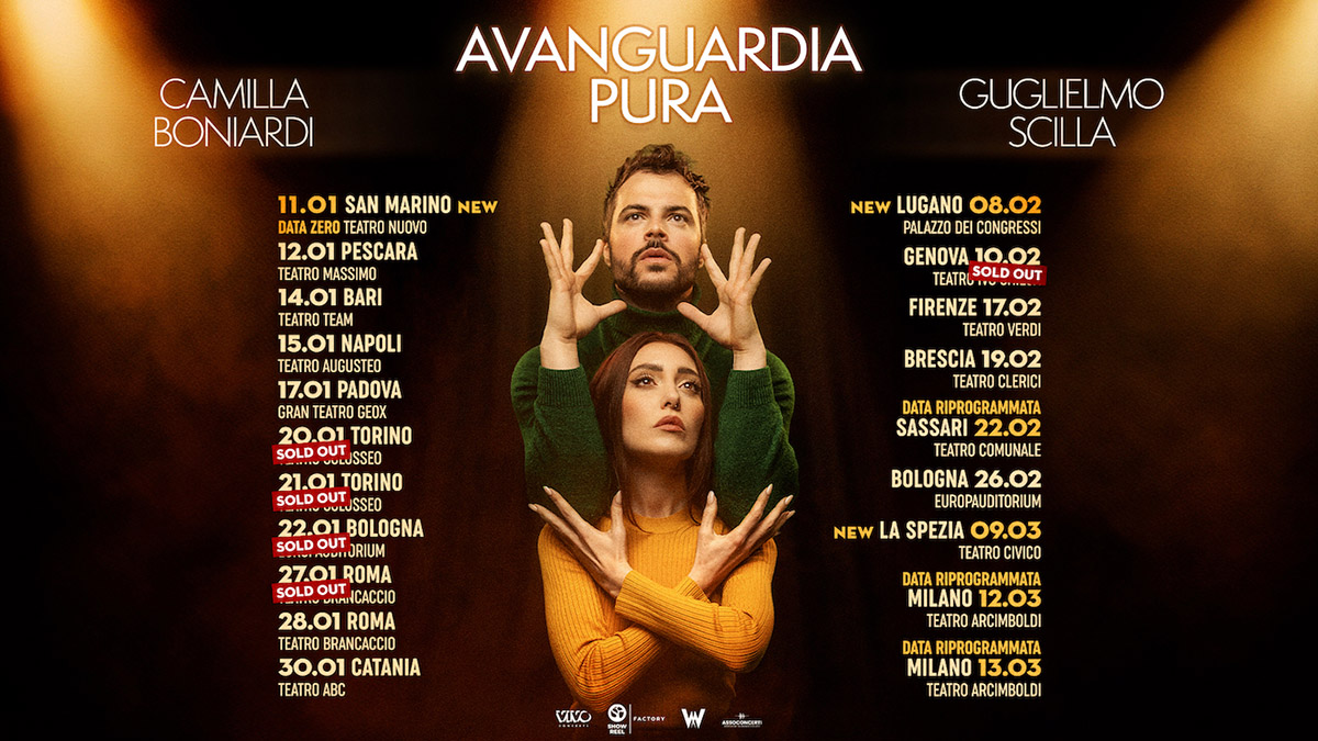 “Avanguardia pura”, il primo tour teatrale di Camihawke e Guglielmo Scilla, in partenza a gennaio 2025, continua a riscuotere successo. Registrano il sold out anche il secondo show di Torino (21 gennaio) e quello di Genova del 10 febbraio.