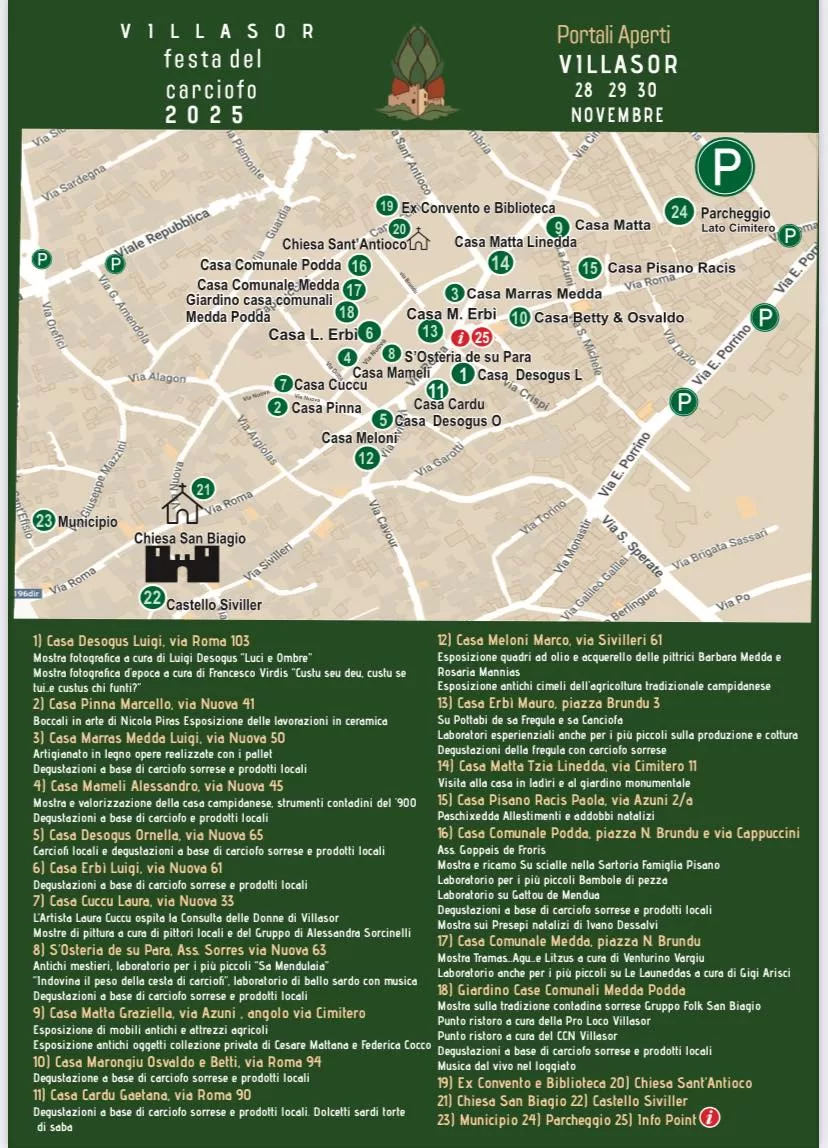 La Festa del Carciofo anima anche i luoghi storici di Villasor: nell’Ex Convento Cappuccini sono visitabili mostre tematiche e laboratori creativi per bambini, mentre Casa Medda/Podda ospita esposizioni, degustazioni e lezioni a cura di associazioni locali. La chiesa di San Biagio rientra tra i monumenti coinvolti nel circuito delle visite guidate. Non manca l’arte, con “La Via dell’Arte” in via Nuova, esposizione collettiva degli artisti sorresi. L’iniziativa offre un’ampia panoramica sulla tradizione agricola, favorendo il dialogo tra innovazione, cultura e gusto.