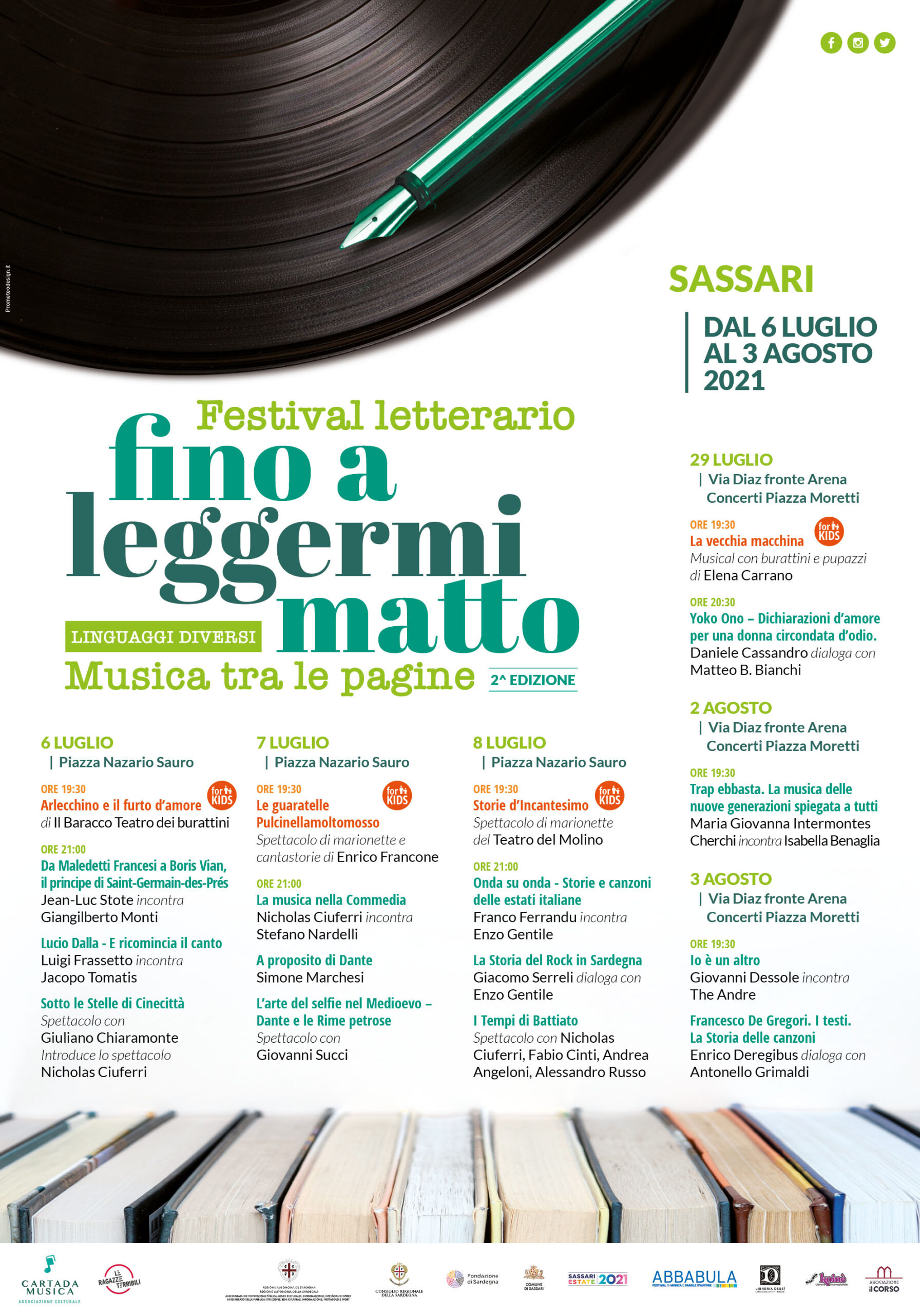 “Fino a leggermi matto – Musica tra le pagine” concede il bis, si conferma appuntamento dell’estate sassarese, rilancia la posta e si prepara a raccontare la sua seconda edizione. Il festival letterario, organizzato dall’associazione culturale Carta da Musica in collaborazione con la società cooperativa Le Ragazze Terribili, è in programma a Sassari fra piazza Nazario Sauro e via Diaz (Spazio fronte area concerti in piazza Moretti) nelle giornate del 6-7-8 e 29 luglio, e 2-3 agosto.