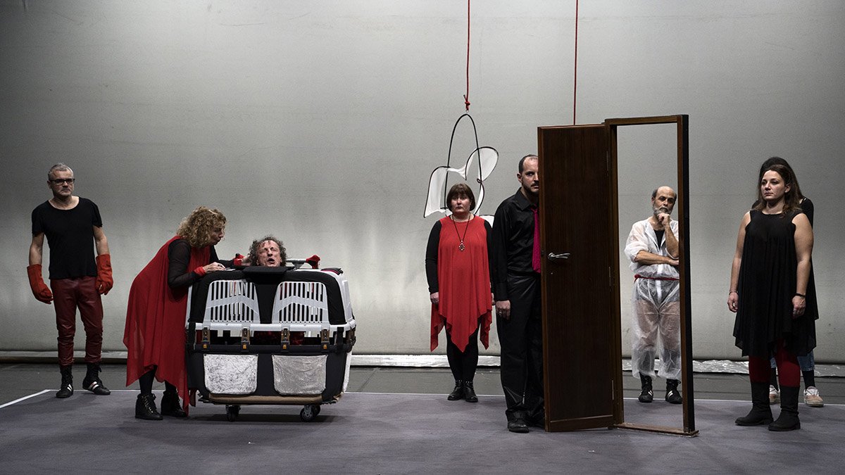 Stavolta in scena portano il “Dentro e il Fuori”. C’è una porta con il suo telaio, trasportata, aperta e richiusa centinaia di volte durante lo spettacolo, ora a fare da cesura tra un ambiente, casa o stanza, e l’anticamera del mondo altro, ora a dividere questo mondo in un Dentro e in un Fuori, spunto per elucubrazioni inestricabili e scaltre sull’essere.