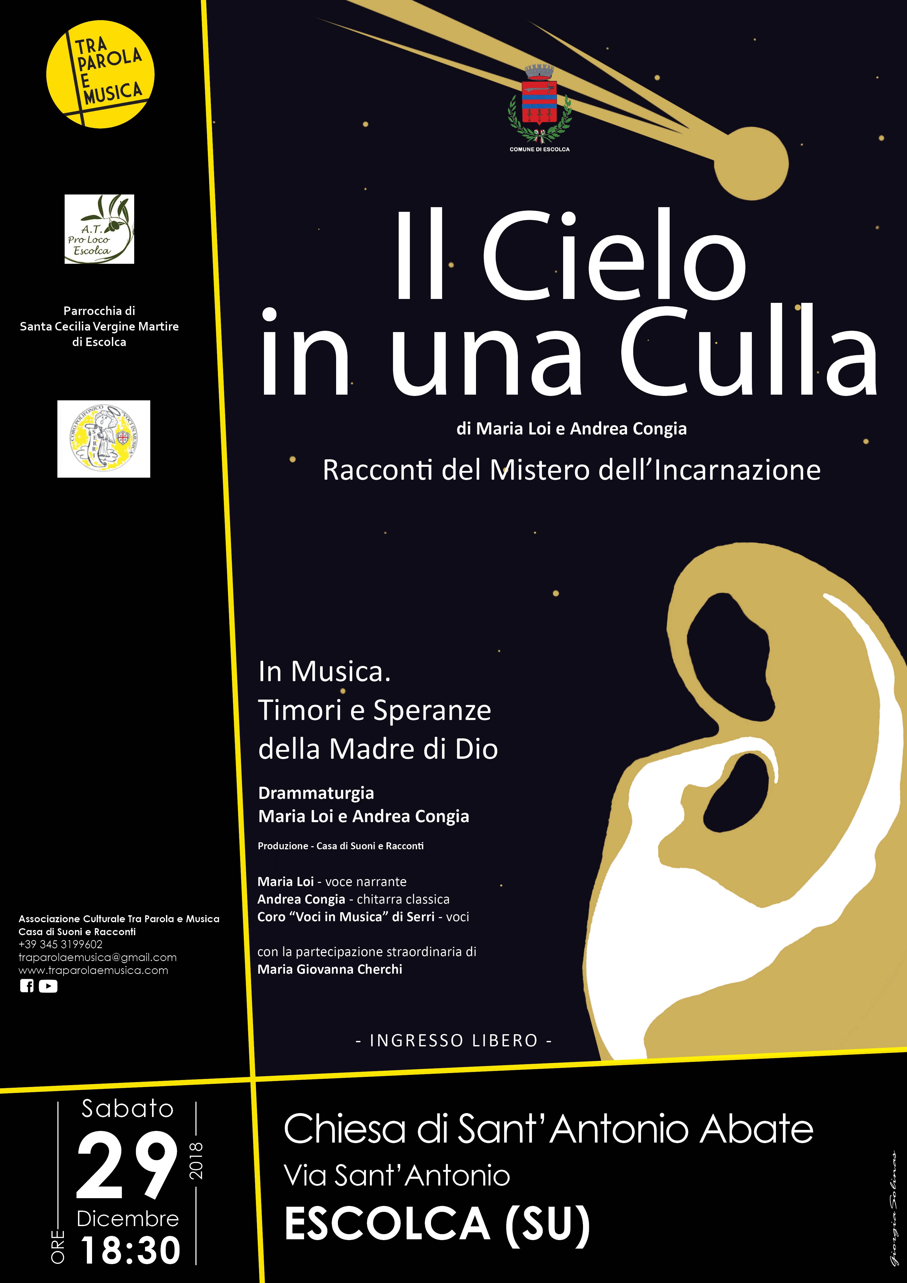 Per salutare l’anno il Comune di Escolca propone alla Comunità lo spettacolo Il Cielo in una Culla. Oggi, sabato 29 Dicembre 2018, nella Chiesa di Sant’Antonio Abate, alle ore 18:30, l’attrice Maria Loi e il musicista e compositore Andrea Congia racconteranno, tra Parola e Musica, la vita e le scelte di Maria di Nazareth all’interno del percorso narrativo che vuole far emergere la sua straordinaria adesione al Progetto Divino, un Atto di Fede che va oltre gli umani timori.