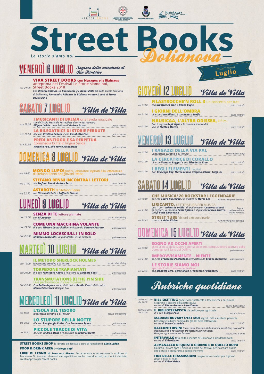 Organizzato dal Circolo dei Lettori Miele Amaro con la direzione artistica di Gianni Stocchino e sostenuto dall’amministrazione comunale di Dolianova e dall’assessorato regionale della pubblica istruzione, beni culturali, informazione, spettacolo e sport, il festival Street Books – Scrittori, lettori e libri a Dolianova proporrà inoltre ogni giorno dalle 21 alle 22.30 il servizio Bibliositting (grazie al quale anche i più piccoli potranno scoprire il piacere della lettura con Eliana Aramu e Lara Zanda), l’appuntamento con Dario Cosseddu e la sua rubrica “Madame Bovary c’est moi” (dedicato alla vita segreta dei grandi nomi della letteratura) e con il Bibioterapista Giorgio Polo, che in maniera ironica prescriverà la lettura di libri ai suoi “pazienti” tutti i giorni dalle 20.15 alle 21 a Villa de Villa. Ma ci sarà spazio anche per i Racconti DiVini, con nove prodotti delle cantine di Dolianova proposti in degustazione e raccontati, tra letteratura e musica, insieme all’Almanacco di questo giorno e di quello dopo a cura di Gerardo Ferrara, all’Intervallo (con le foto edite e inedite di Dolianova) e i Titoli di coda, a cura di Video Vision.
