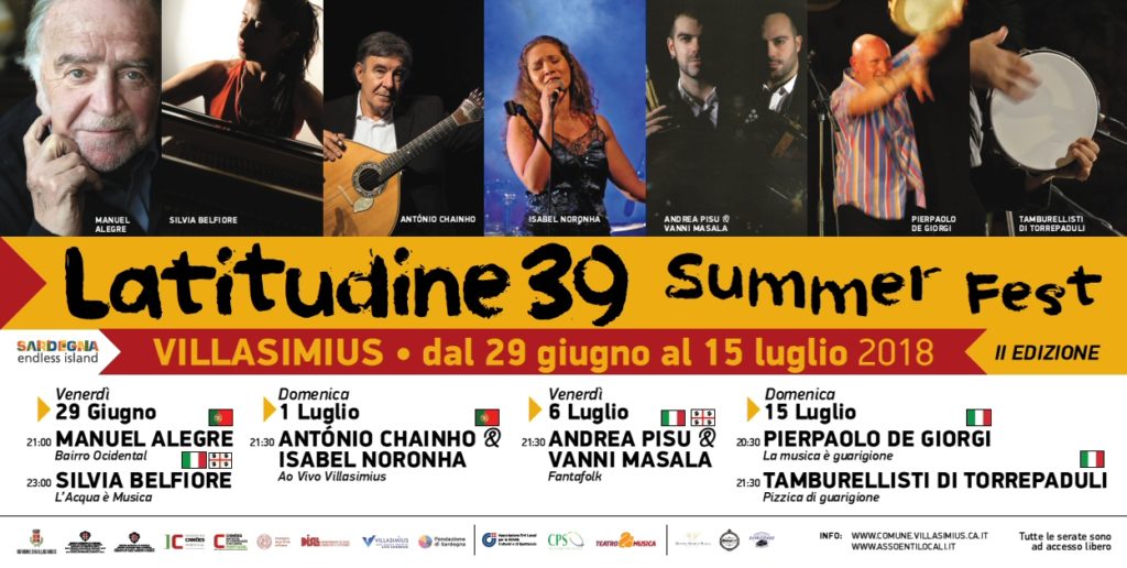 Cultura e musica di eccellente qualità nella seconda edizione della manifestazione internazionale “Latitudine 39 – Summer Fest”, organizzata a Villasimius dal Comune in collaborazione con l’Associazione Enti Locali per le Attività Culturali e di Spettacolo, con il sostegno della Fondazione di Sardegna e il patrocinio dell’Instituto Camões Portugal, dell’Università di Padova e del suo Dipartimento di studi linguistici e letterari. Dal 29 giugno al 15 luglio quattro serate e sei eventi straordinari (aperti a tutti e gratuiti) nei tre punti nevralgici del paese, Giardini al Parco Bussi, Piazza Gramsci e Porto Turistico, a due passi dalle acque limpide e cristalline delle calette, tra dune di sabbia bianca e scenari incantevoli.