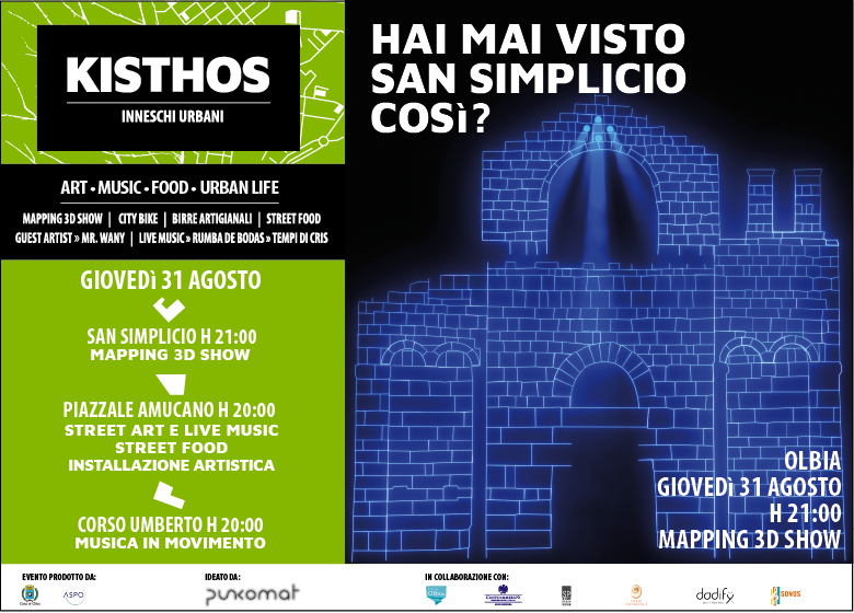 Kisthos è ideato da Punkomat Project, coordinatore del progetto, autore dei contenuti video, della comunicazione e creatore del mapping 3d su San Simplicio. L’organizzazione si avvale della collaborazione di professionalità locali come Dodify, SP Design, Olbia Experience, Sonos e Confcommercio.