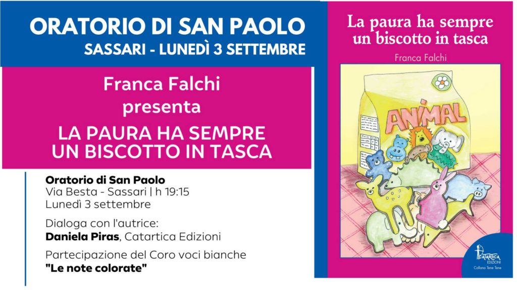 Si terrà il giorno lunedì 3 settembre a Sassari, nell’oratorio di San Paolo, in via Besta, alle ore 19:15, la presentazione del libro di Franca Falchi “La paura ha sempre un biscotto in tasca”. Dialogherà con l’autrice Daniela Piras, Catartica Edizioni. L’appuntamento, organizzato dalla Libreria Internazionale Koinè, vede la partecipazione del coro voci bianche “Le note colorate”, dell’associazione musicale Gioacchino Rossini, diretto dal Maestro Claudia Dolce.