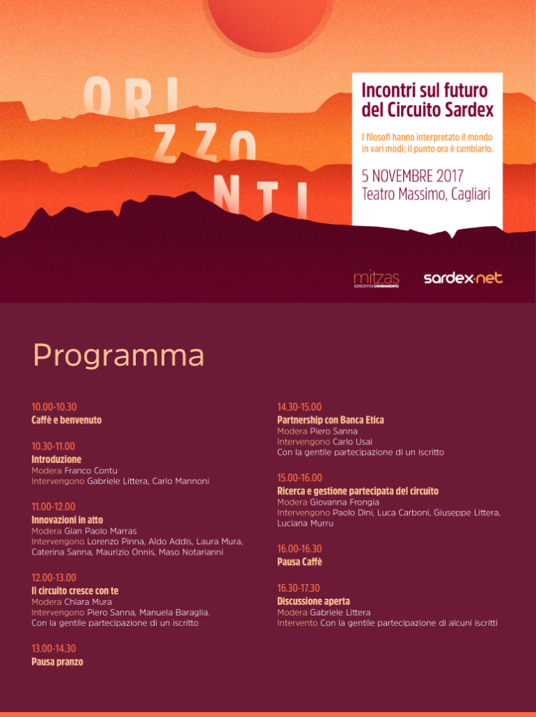 “Orizzonti”: è il tema di Mitzas 2017, il festival dedicato alla Sardegna che cambia, organizzato da Sardex.net con Eja TV nel ruolo di media partner. L’appuntamento, giunto alla quarta edizione e inserito nel contesto del Festival 10 NODI, è per domenica 5 novembre – dalle 10 alle 18 – al Teatro Massimo di via De Magistris 12 a Cagliari. Rispetto agli anni precedenti – caratterizzati da una forte proiezione verso l’esterno – il festival di quest’anno avrà una marcata attenzione verso l’interno, al dialogo e al confronto con gli iscritti.