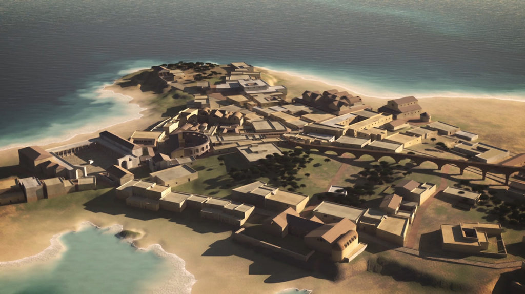 Come sono stati realizzati i rendering in 3D? Per prima cosa è stato progettato un modello di elevazione, ossia la rappresentazione delle quote dell’antico territorio fenicio e poi romano in formato digitale. Grazie a uno studio approfondito sui materiali usati dai Romani per la costruzione degli edifici della Nora antica, come i blocchi di arenaria, i mattoni di fango, le lastre di marmo e le travi di legno, è stato possibile realizzare immagini ancora più realistiche e accattivanti. In modo da rendere il tutto più verosimile, nel sito sono stati piazzati dei punti luce come candelieri e bracieri, in modo da dare l’effetto dell’illuminazione esistente al tempo.