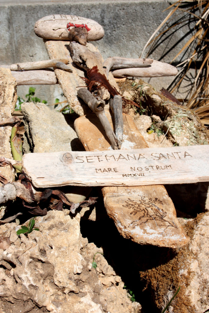 L’opera, oltre alla scritta Setmana Santa, riporta anche l’espressione MARE NOSTRUM, che dà il titolo all’elaborato. Una scelta significativa quella dello studente, che dedica la sua opera ai caduti in mare, a coloro i quali, per un viaggio o per una fuga, si sono trovati in balia delle onde e non hanno raggiunto la terra vivi, proprio come i legni raccolti dal giovane artista. L’assemblaggio dei vari pezzi rappresenta il ricordo di queste persone e diventa simbolo di amore e fede: nessun nome o cognome prevalgono, ma solo un destino comune.