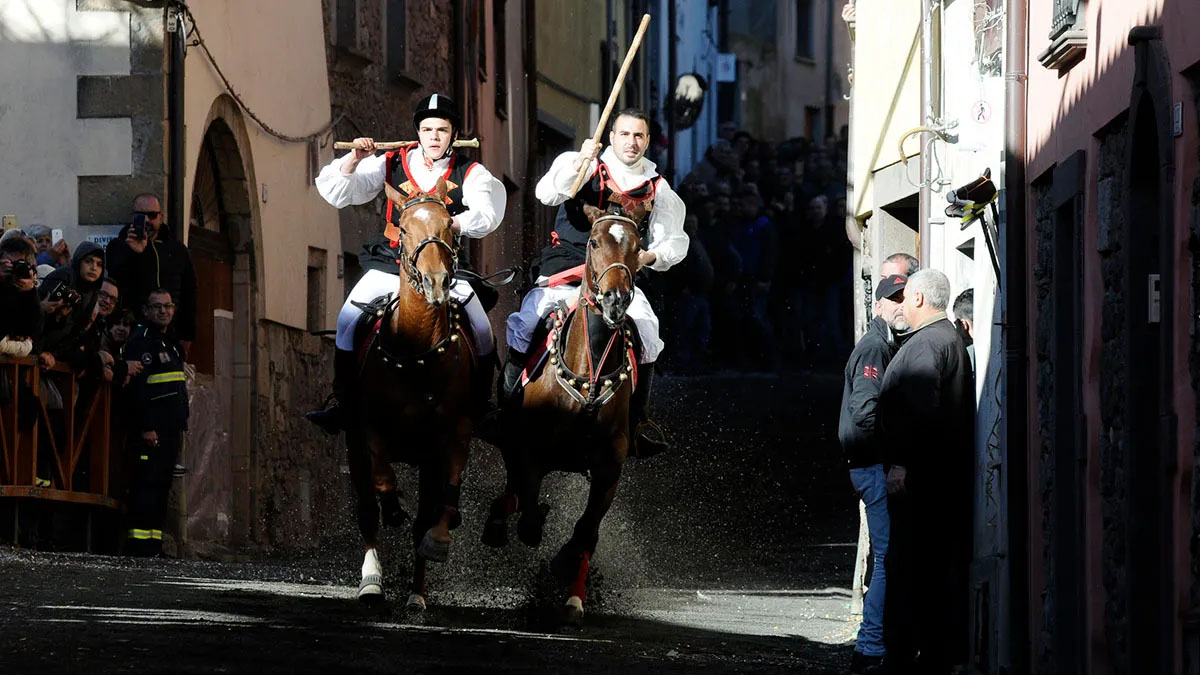 In questo antico borgo di montagna, situato ai piedi del Montiferru, in provincia di Oristano, caratterizzato da strette vie acciottolate e antiche case dai muri in pietra e dai portoni dove spiccano gli antichi batacchi, le tradizioni equestri affondano le loro radici nel tardo Medioevo e si sono poi sviluppate grazie ai giudici di Arborea e ai viceré spagnoli che favorirono l’allevamento di razze speciali di cavalli dedite alla corsa, divenute poi il simbolo per eccellenza delle feste di Santu Lussurgiu. Ecco dunque che, in concomitanza col Carnevale, si svolge qui la manifestazione di Sa Carrela ‘e Nanti, che letteralmente significa “strada che si trova davanti”, in quanto prende il nome dalla storica strada dove si svolge l’evento, via Roma, la via principale del paese che, per l’occasione, si trasforma in una strada sterrata.