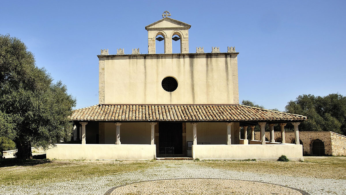 Alla devota atmosfera dell’interno si accompagna un’altrettanta peculiarità esterna, con dimensioni insolite per la tipologia campestre, solitamente assai semplici e poco ampie. Lo sguardo si apre infatti su una facciata con finestra circolare in alto al centro e suddivisa orizzontalmente in 2 parti da un loggiato, che corre su 3 lati della struttura e si compone di canne intrecciate poste su colonne di pietra. A completare il tutto, infine, un campanile a vela – ossia con muro traforato entro cui vi sono le campane – inserito a sua volta in un impianto architettonico circondato da un parco e spettacolari olivastri millenari.