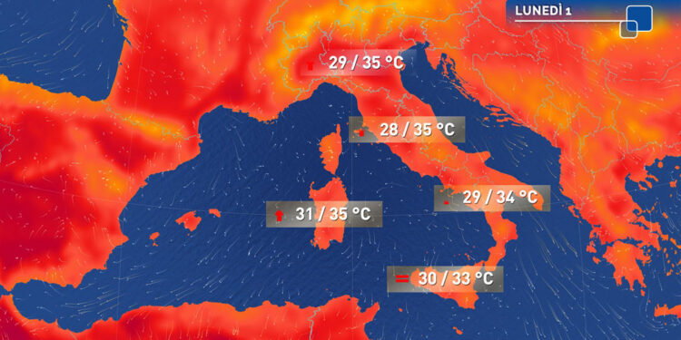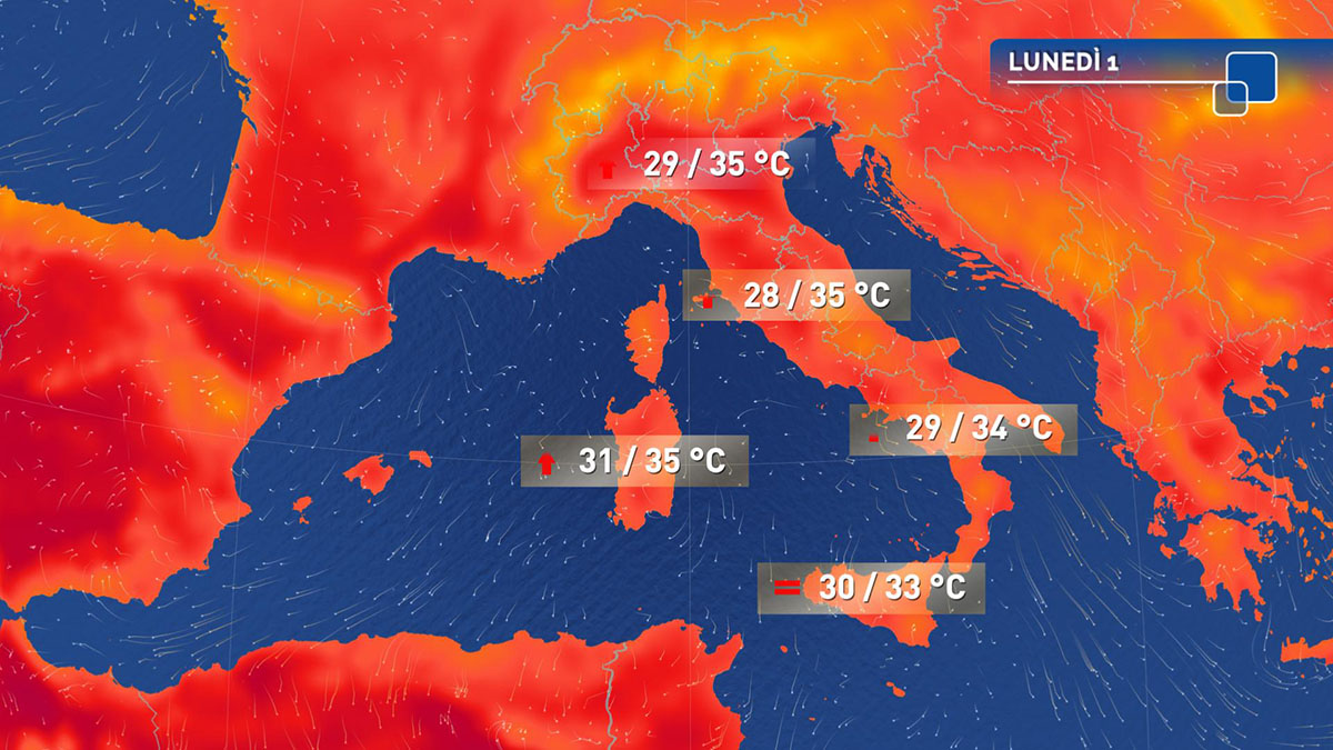 Temperature senza grandi variazioni, al più in lieve aumento e ovunque superiori alle medie stagionali; massime pomeridiane ovunque oltre i 30 gradi e per lo più comprese tra 31 e 35 con punte di 36-38 gradi tra sudest della Lombardia ed Emilia e in Sardegna, Toscana, Umbria e Lazio.