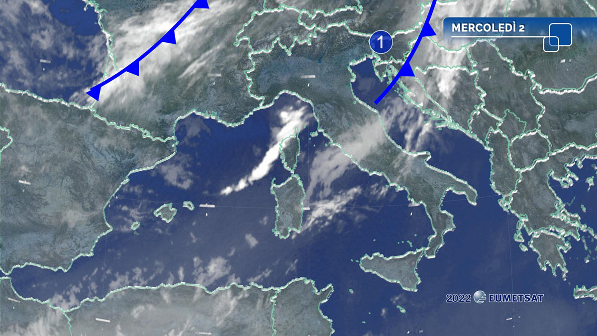 Giovedì tempo per lo più soleggiato con solo modesti annuvolamenti per buona parte della giornata su Abruzzo, Molise, Puglia, Basilicata, Calabria e isole maggiori. Da nuvoloso a coperto nel resto del Paese con qualche debole e isolata pioggia al mattino su alta pianura padana, zone prealpine, Liguria centro-orientale, alta Toscana e coste del medio versante tirrenico. Possibili nebbie o foschie in Emilia e nelle valli del Centro. Nel pomeriggio precipitazioni sparse al Nord-Ovest e Prealpi orientali e, sporadicamente, anche su Lazio e Campania; primi temporali sul Ponente Ligure. Verso sera deciso peggioramento nelle regioni nord-occidentali, con piogge in intensificazione, anche a carattere di rovescio o temporale in Liguria e alta Toscana, e in estensione nella notte al resto del Nord, regioni centrali tirreniche e Sardegna; possibili fenomeni di forte intensità dalla serata, con successivo calo della quota neve sulle Alpi occidentali.