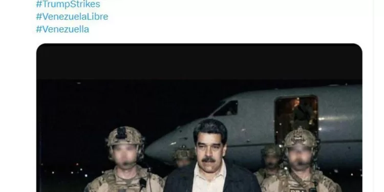 (Adnkronos) – Il presidente venezuelano Nicolas Maduro tra due militari americani, le mani dietro alla schiena, presumibilmente con le manette ai polsi. Questo mostra la foto apparsa su diversi social media e non confermata da fonti ufficiali che potrebbe fornire la prima immagine della cattura di Maduro dopo l’annuncio del presidente americano Donald Trump.