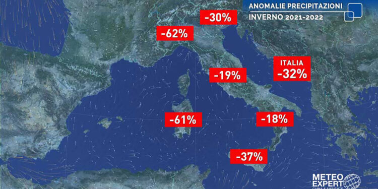 L’inverno 2021-2022 è il sesto più secco degli ultimi 63 anni. Anche l’inverno nel suo insieme, come già accennato, è stato mediamente mite e siccitoso, con un’anomalia termica di +0.8°C e un deficit pluviometrico pari a -32% (equivalente a quasi 16 miliardi di metri cubi di acqua in meno): lo scarto dal valore medio della temperatura si pone al 11° posto fra i più elevati, mentre il dato relativo alle precipitazioni fa di questa stagione invernale la 6° più asciutta della serie storica.