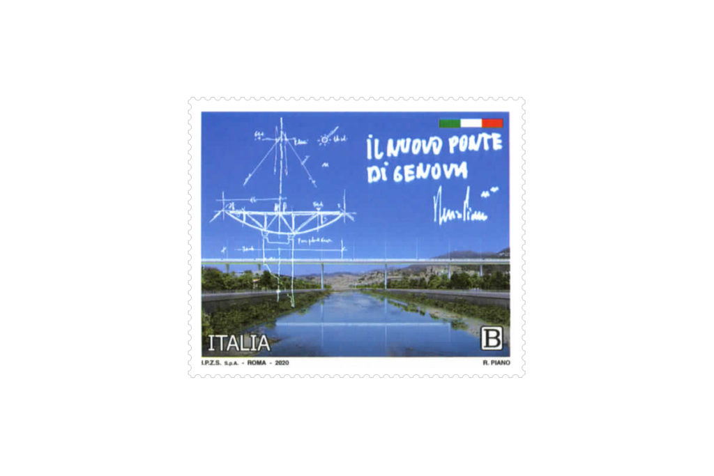 Completano il francobollo la scritta “IL NUOVO PONTE DI GENOVA” redatta a mano dall’architetto Renzo Piano, seguita dalla sua firma, la scritta “ITALIA” e l’indicazione della tariffa B.