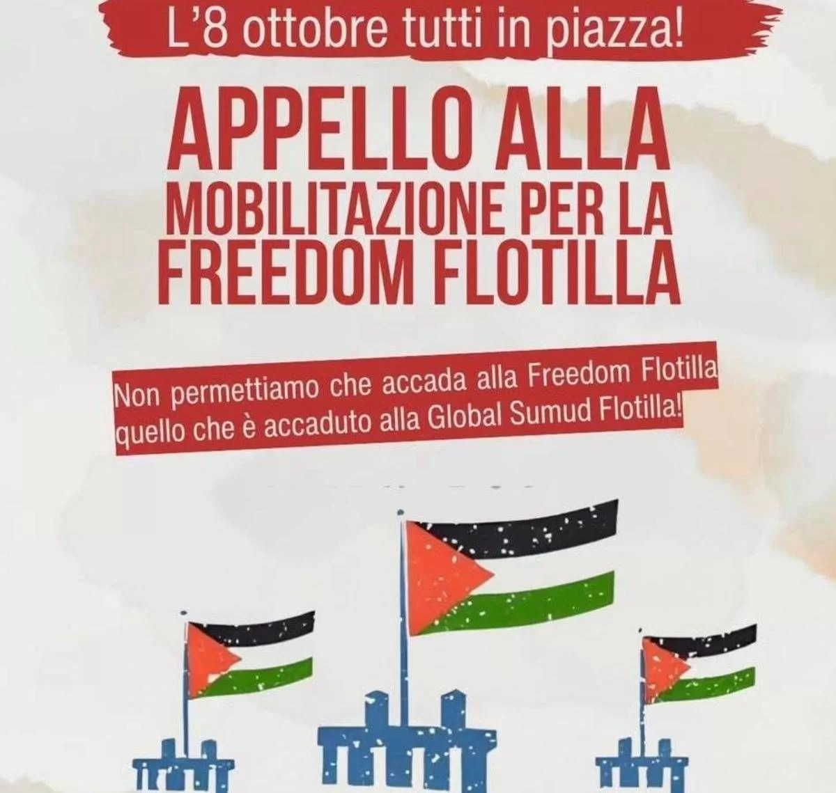 (Adnkronos) – “L’8 ottobre tutti in piazza, appello alla mobilitazione per la Freedom Flotilla, non permettiamo che accada alla Freedom Flotilla quello che è accaduto alla Global Sumud Flotilla”. Così, tramite i canali social, Freedom Flotilla Italia, Giovani Palestinesi Italia, Movimento studenti palestinesi in Italia e Unione Democratica Arabo-Palestinese invitano nuovamente a scendere in strada per Gaza. Nel post, gli attivisti sottolineano che nelle “prossime ore la Freedom Flotilla entrerà nelle acque internazionali vicino a Gaza, dove esiste il concreto rischio che venga intercettata e sequestrata dalle forze israeliane come accaduto in passato”, facendo riferimento all’intercettazione della Global Sumud Flotilla di mercoledì scorso.