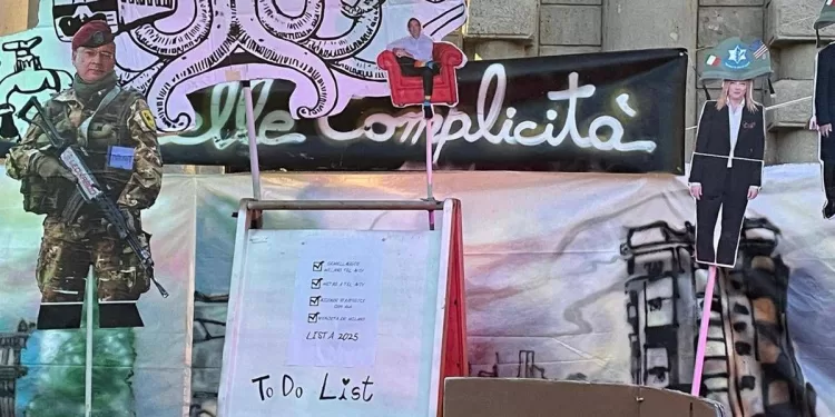 Sul palco allestito davanti a Palazzo Marino campeggiano i cartonati di “ladyMacLoni” (così è stata ribattezzata la premier dal nome della protagonista dell’opera che andrà in scena stasera alla Scala) e dei ministri con in testa un elmetto con le bandiere italiana, israeliana e Usa.