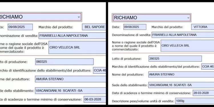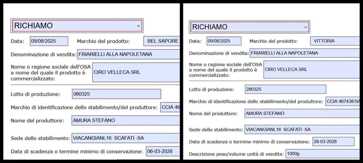 I due marchi sono Bel Sapore e Vittoria, prodotti tutti a Scafati nel Salernitano. Il dicastero nel documento pubblicato chiede, inoltre, il ”ritiro prodotto eventualmente in giacenza”.