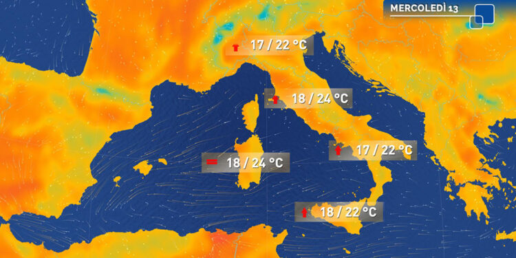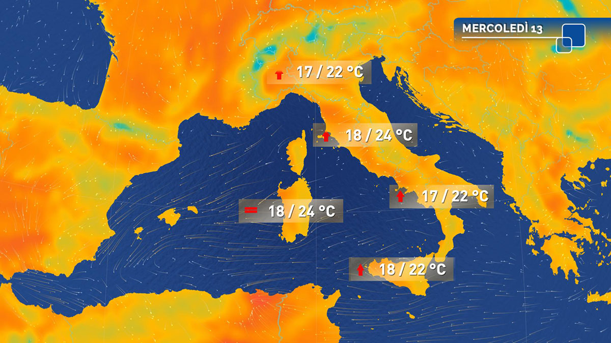 Temperature in lieve aumento, con massime per lo più comprese tra 17 e 22 gradi.