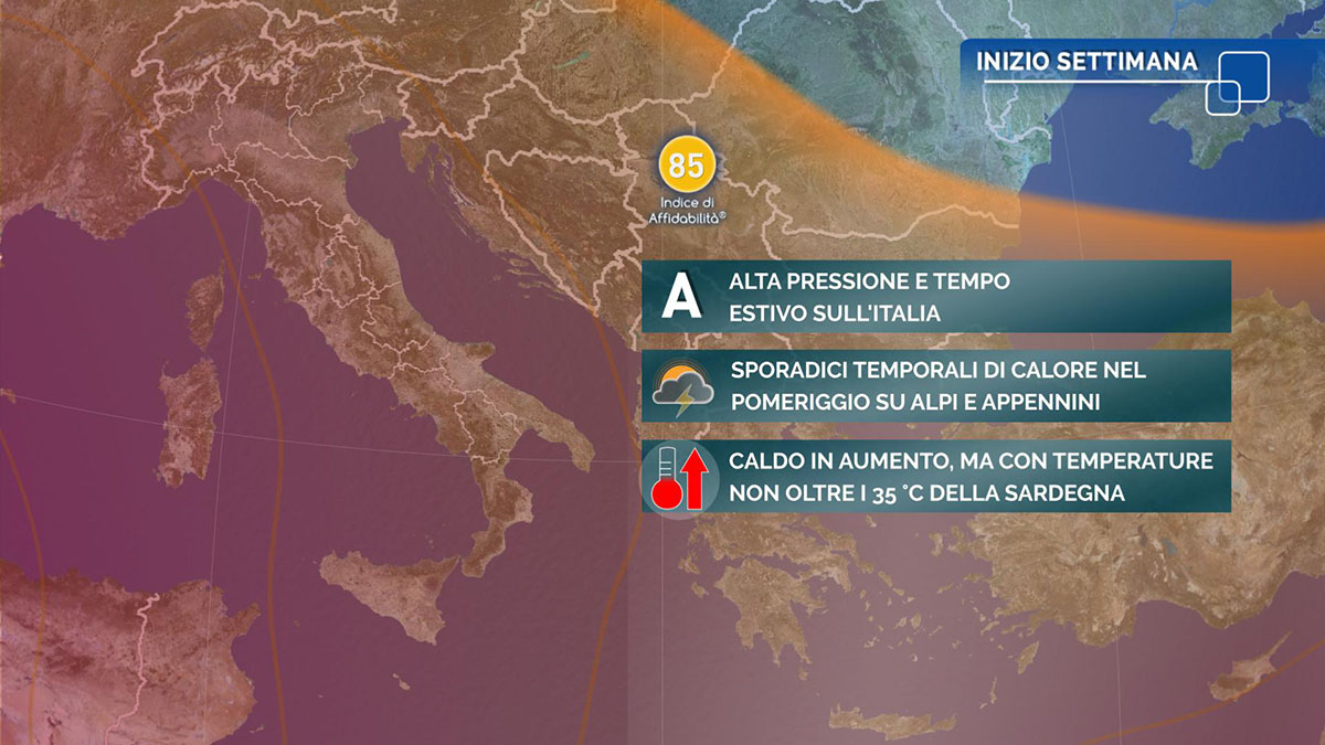 Tempo prevalentemente soleggiato e caldo su tutte le regioni. Nelle ore più calde occasionali temporali sulle aree montuose del Reatino, della Toscana settentrionale, dell’Abruzzo e del Molise.