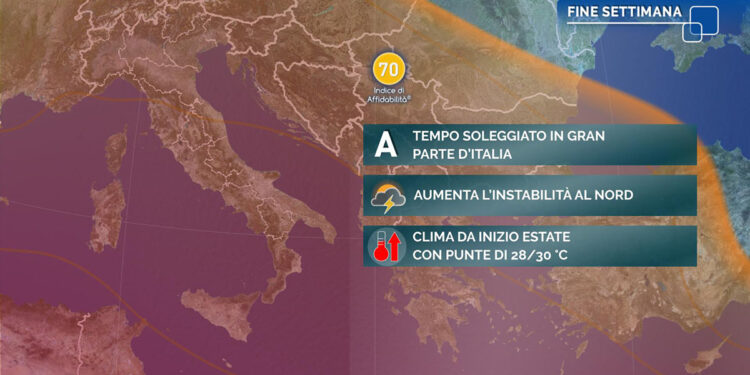 Un campo di alta pressione di matrice sub-tropicale abbraccia gran parte dell’area mediterranea e dell’Europa meridionale, favorendo un tempo prevalentemente soleggiato anche sull’Italia, in particolare sulle regioni centro-meridionali. La lingua di aria calda associata, che si allunga dall’Algeria, ha dato il via a una fase con temperature oltre la norma, tipiche dell’inizio dell’estate. I maggiori scostamenti dalla media si registrano al Nord, dove l’anomalia è dell’ordine dei 6-8 gradi. Tuttavia proprio sulle regioni settentrionali assistiamo, in queste ore, a un parziale indebolimento dell’alta pressione, coincidente con il passaggio della coda meridionale di una perturbazione atlantica sopra la regione alpina, che alimenterà un po’ di instabilità atmosferica. Qualche rovescio o temporale potrà svilupparsi soprattutto nelle aree alpine e prealpine, sconfinando in qualche caso nelle vicine pianure. Localmente ci sarà il rischio di temporali forti, accompagnati da grandine. Secondo le attuali proiezioni l’anticiclone manterrà il dominio sull’Italia, accompagnato da un clima decisamente caldo per la stagione, anche nel corso della prossima settimana, quando tuttavia non mancheranno altri locali episodi di instabilità.