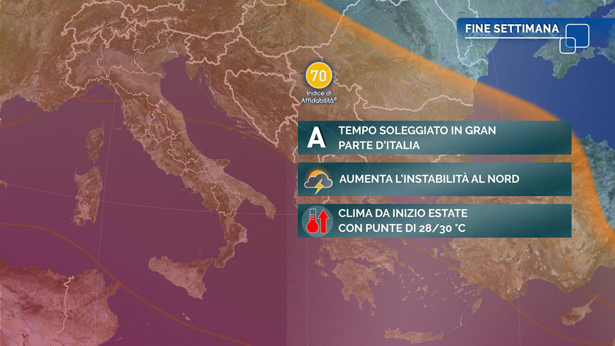 Le previsioni per le prossime ore. Prevalenza di tempo soleggiato al Centro-Sud, in Liguria e in Emilia Romagna, salvo alcune velature passeggere, la presenza di strati bassi in mattinata su Campania e Calabria tirrenica e lo sviluppo di cumuli sui rilievi nelle ore più calde della giornata. Nel resto del Nord nuvole variabili, con le schiarite alternate ad un cielo da parzialmente nuvoloso a nuvoloso, e atmosfera instabile. L’instabilità interesserà in giornata un po’ tutto il settore alpino e prealpino, con locale coinvolgimento delle vicine pianure di Piemonte, Lombardia, Veneto e Friuli. Localmente saranno possibili forti temporali associati anche a grandine e raffiche di vento. Temperature massime senza grosse variazioni, fino a 6-8 gradi oltre la norma. Clima da inizio estate, con valori generalmente compresi fra 24 e 30 gradi. Venti in generale deboli, con brezze lungo le coste e locali rinforzi da nord-ovest sull’Adriatico centro-meridionale e nel Canale d’Otranto. Temporanee raffiche nelle aree temporalesche. Mari calmi o poco mossi.
