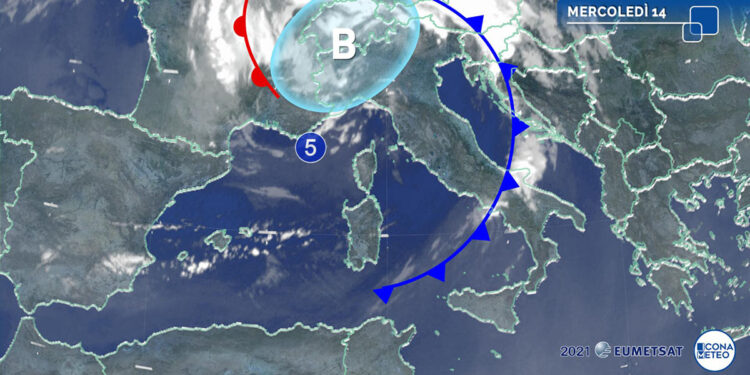 Sulle regioni centro-meridionali e sulle isole maggiori tempo generalmente soleggiato con temporanei annuvolamenti sui settori tirrenici, più compatti sulla Toscana settentrionale dove non si escludono locali piogge al mattino. Nubi più estese e compatte al Nord, con piogge o rovesci inizialmente isolati sulle Alpi centro-orientali, tendenti a divenire gradualmente più diffusi e in estensione anche al settore alpino occidentale tra pomeriggio e sera; qualche isolata pioggia sarà possibile anche sulle vicine pianure di Lombardia e Veneto.