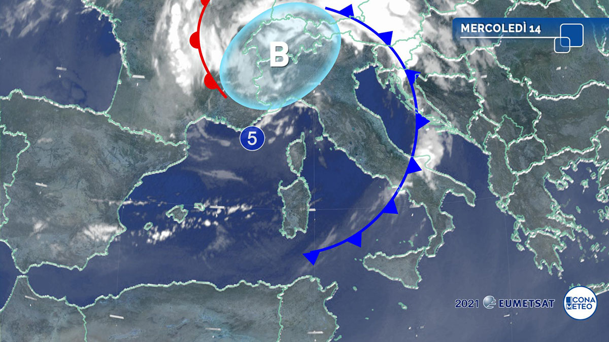 Sulle regioni centro-meridionali e sulle isole maggiori tempo generalmente soleggiato con temporanei annuvolamenti sui settori tirrenici, più compatti sulla Toscana settentrionale dove non si escludono locali piogge al mattino. Nubi più estese e compatte al Nord, con piogge o rovesci inizialmente isolati sulle Alpi centro-orientali, tendenti a divenire gradualmente più diffusi e in estensione anche al settore alpino occidentale tra pomeriggio e sera; qualche isolata pioggia sarà possibile anche sulle vicine pianure di Lombardia e Veneto.