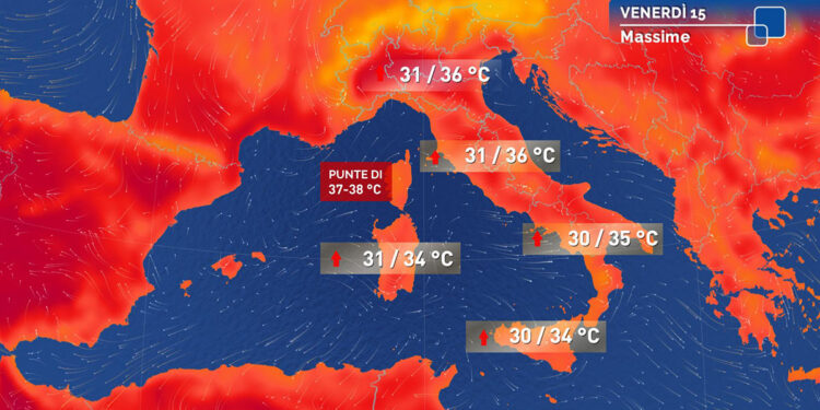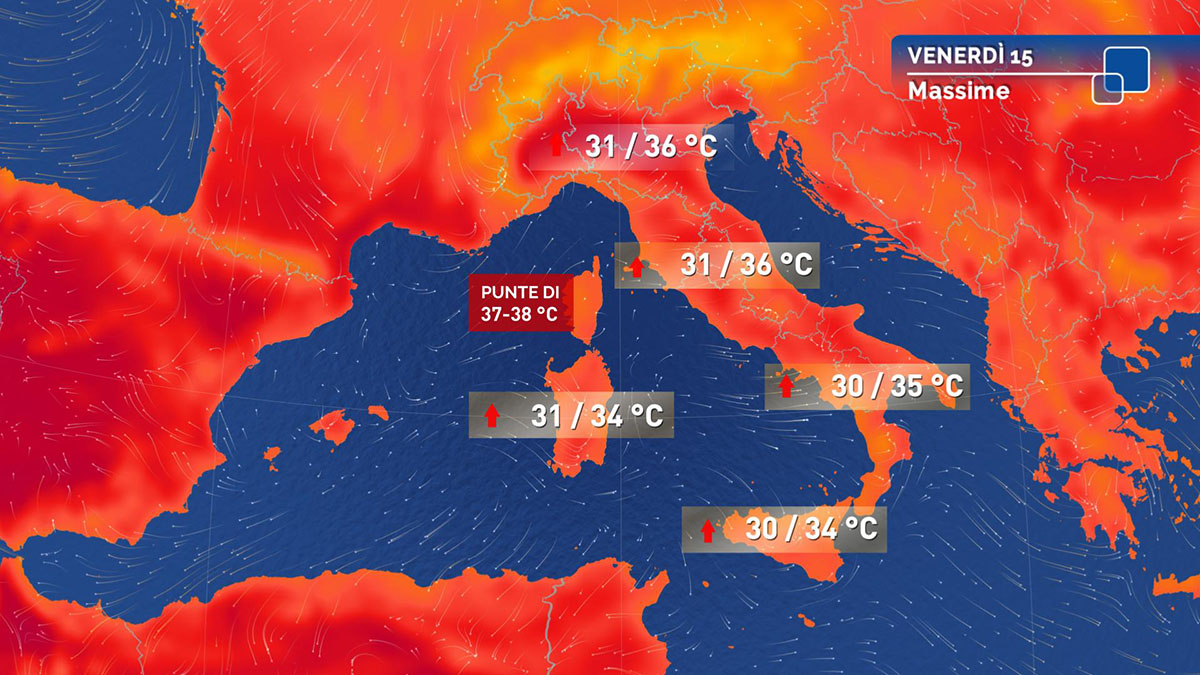 Temperature in aumento quasi ovunque nei valori massimi, per lo più compresi fra 28 e 33 gradi, ma con punte di 34-37 gradi al Nord, sulle regioni centrali tirreniche e in Sardegna.