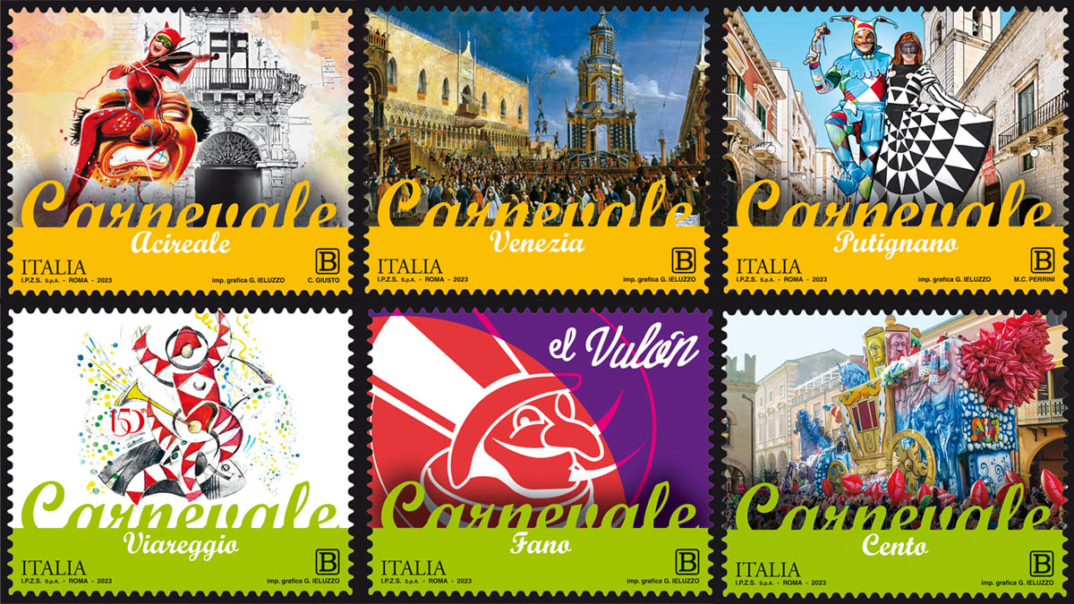 Oggi, 16 febbraio 2023 vengono emessi dal Ministero delle Imprese e del Made in Italy 6 francobolli ordinari appartenenti alla serie tematica “Il Patrimonio artistico e culturale italiano” dedicat ai Carnevali più antichi d’Italia: il Carnevale di Venezia, il Carnevale di Fano, il Carnevale di Putignano, il Carnevale di Acireale, il Carnevale di Cento, il Carnevale di Viareggio, relativi al valore della tariffa B pari a 1,20€ per ciascun francobollo.