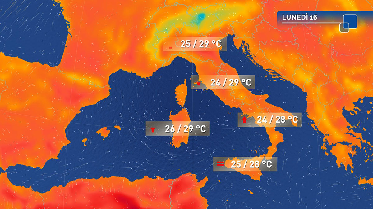 Temperature: senza grandi variazioni e con valori estivi, sensibilmente superiori alla norma; massime per lo più comprese tra 25 e 29 gradi. Venti ovunque deboli, salvo rinforzi di brezza lungo i litorali e nelle valli; temporanei rinforzi nelle aree temporalesche. Mari calmi o poco mossi.