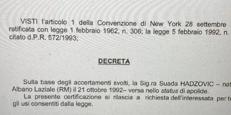 Nel corso degli anni, Suada e i legali ai quali si è rivolta tentano diverse strade, incluse la richiesta di cittadinanza per residenza e la richiesta dello status di apolide. Ma tutte le istanze si infrangono su sentenze di Tribunale che non indicano mai una soluzione al problema. “Fatto sta che mi ritrovo a 32 anni prigioniera di un Paese, in cui sono nata e in cui vivo da sempre, che non mi riconosce come cittadina e che sostiene io sia cittadina di un altro Stato in cui non ho mai messo piede”, sintetizzava con amarezza un fa, in attesa di rivolgersi al prossimo legale e di fare l’ennesimo tentativo per uscire dalla sua condizione di ostaggio. Diventata adulta, con un compagno e un figlio italiani, rimane senza nazionalità e senza cittadinanza, priva di passaporto e con una carta d’identità che continua a recitare la dicitura ‘non valida per l’espatrio’. Da oggi, però, lo status di apolide libera Suada Hadzovic dalla sua condizione e le restituisce, finalmente, il diritto a muoversi anche fuori dall’Italia. (Di Fabio Insenga)
