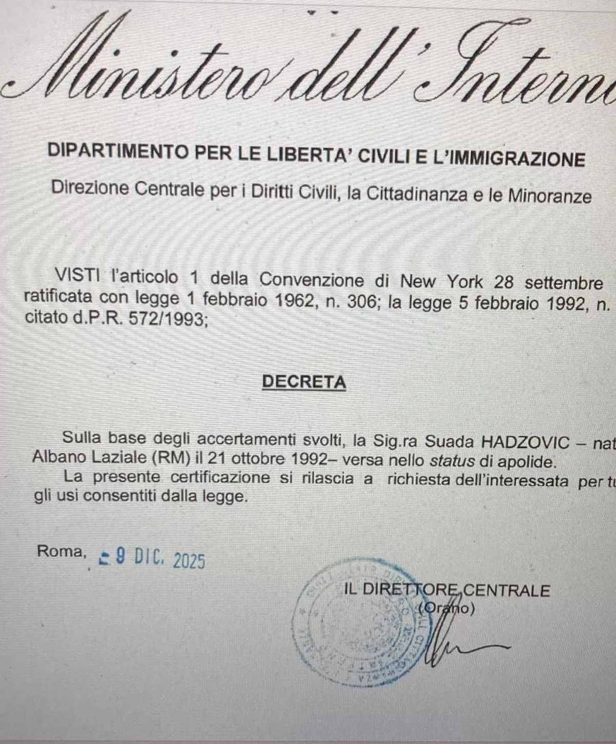 (Adnkronos) – E’ arrivato un provvedimento che fa giustizia in una storia che si trascinava da troppi anni. A Suada Hadzovic, trentatré anni vissuti tutti in Italia fin dalla nascita, un decreto del Dipartimento per le libertà civili e l’immigrazione del Ministero dell’Interno ha riconosciuto lo status di apolide. Una conquista, quella attestata nel documento che porta la data del 9 dicembre in possesso dell’Adnkronos, che la libera da una condizione di surreale costrizione, di fatto ostaggio del Paese in cui è nata e cresciuta perché impossibilitata ad avere un documento, il passaporto o anche solo la carta d’identità valida per l’espatrio. La storia di Suada era stata denunciata dall’agenzia di stampa più di un anno fa, a novembre 2024, evidenziando le conseguenze grottesche di un ‘buco’ di legislazione in cui è finita per la sola ‘colpa’ di un percorso di vita difficile, complicato ulteriormente dal cortocircuito di una burocrazia che ha prodotto un evidente paradosso. Oggi, il provvedimento amministrativo che le restituisce la libertà.