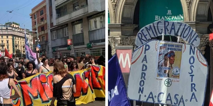 ‘Fuori i razzisti e fascisti da Milano’, ‘Milano è di chi la vive’, ‘No one is illegal’ e ‘Chi se ne deve andare sono quelli che vogliono cambiare la Costituzione’, sono alcune delle frasi che appaiono sugli striscioni. “Come tutti i sabati -spiegano gli attivisti del Csa Vittoria – siamo ancora in piazza insieme alla Milano antifascista, antirazzista, antimperialista e antisionista, con le bandiere palestinesi contro la presenza a Milano di Salvini e la sua banda europea razzista e xenofoba”.