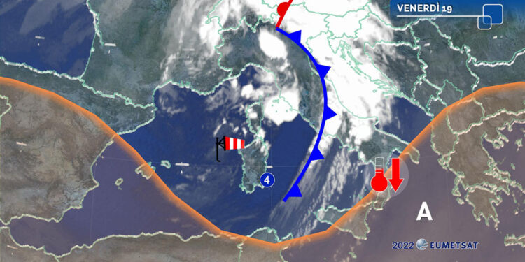 Temperature: in calo sia le minime che le massime al Sud e in Sicilia dove cessa ovunque il caldo intenso; massime in rialzo al Centronord e in Sardegna. Ventoso per Maestrale al Sud e sulle Isole, più intenso in Sardegna e nel Canale di Sicilia con raffiche fino a 50-60 Km/h; moderato foehn nelle valli alpine. Mari: fino a molto mossi i mari meridionali e quelli intorno alle Isole; mossi Adriatico e Tirreno centrali e basso Ligure, per lo più calmi o poco mossi i restanti bacini.