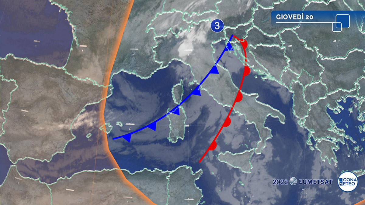 Con l’alta pressione in ritirata verso l’Atlantico, il cui centro va posizionandosi a ovest delle Isole Britanniche, ha inizio per l’Italia una fase dettata da correnti settentrionali più fredde. In questo flusso si muove lungo la Penisola una debole perturbazione i cui effetti, in termini di locali precipitazioni, si faranno sentire oggi principalmente al Centro e sul basso Tirreno, domani sul medio Adriatico e al Sud. Anche la ventilazione diviene più vivace, inizialmente sud-occidentale al Sud e con un teso Maestrale che raggiunge la Sardegna.
