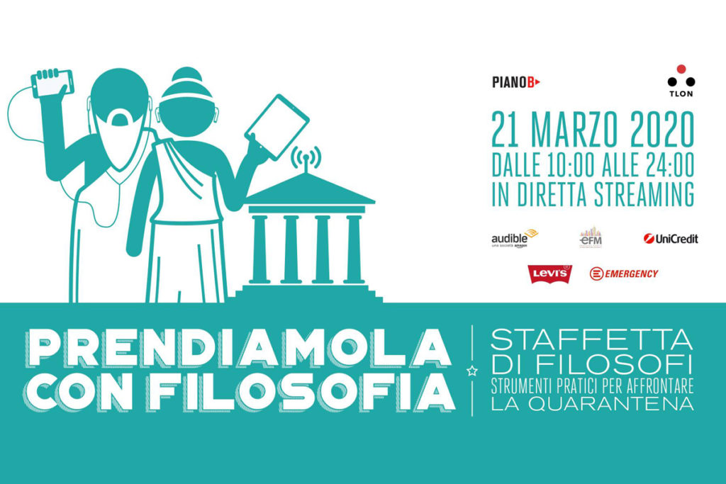 Con questo spirito nasce l’idea di una staffetta di filosofi, in programma oggi 21 marzo, dalle ore 10 alle 24, rigorosamente in streaming, sul sito prendiamolaconfilosofia.it, per offrirci strumenti pratici per affrontare la quarantena. Protagonisti volti noti della filosofia e non solo: da Umberto Galimberti e Roger-Pol Droit, a Marco Montemagno, Erri De Luca, Jovanotti, Roberto Saviano, Paola Maugeri, Laura Campanello, Alessandro Baricco e tantissimi altri. Ideatori del progetto: i filosofi Andrea Colamedici e Maura Gancitano.