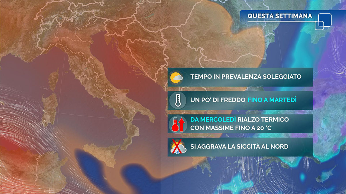 Entro mercoledì le correnti fredde si attenueranno lasciando il posto all’alta pressione, accompagnata da una massa d’aria più mite che determinerà un sensibile rialzo termico fino a valori anche sopra la media, con punte intorno ai 20 gradi in un contesto di tempo stabile e sostanziale assenza di precipitazioni.