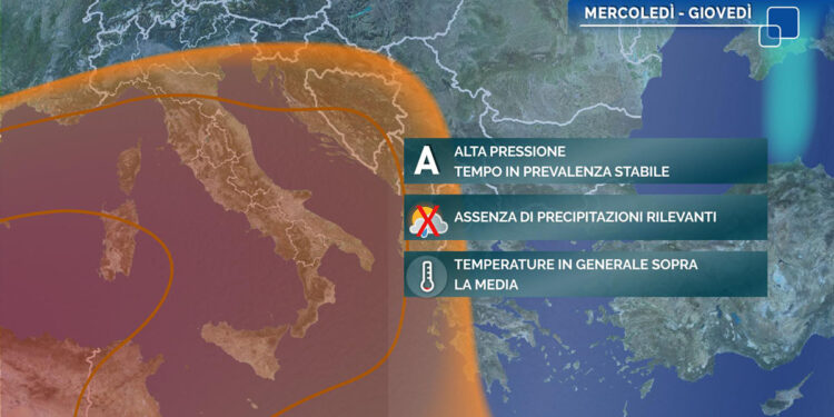 Temperature superiori alla norma; minime per lo più stabili o in lieve aumento; massime in lieve calo sul Nord-Ovest, in leggero rialzo al Sud e sulla Sardegna con punte oltre i 20 gradi. Venti quasi ovunque deboli e mari calmi o poco mossi; localmente mosso il mar Ligure.