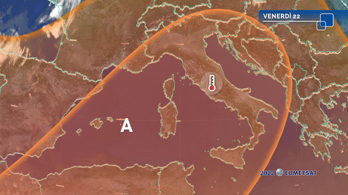 Temperature stabili o in ulteriore lieve aumento e su valori estremamente elevati: massime a basse quote diffusamente oltre i 35 gradi da Nord a Sud, più contenute localmente lungo le coste dove vengono mitigate dalle brezze marine; in Val Padana e nelle aree interne del Centro-Sud punte di 38-40 gradi.