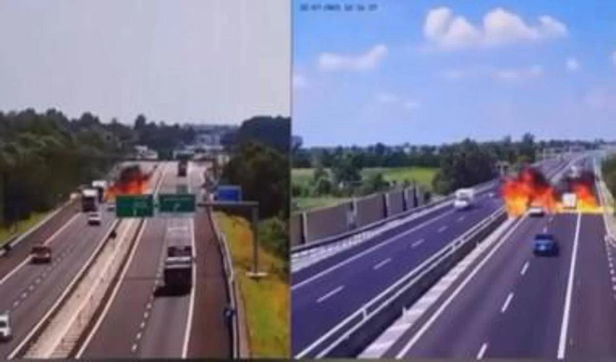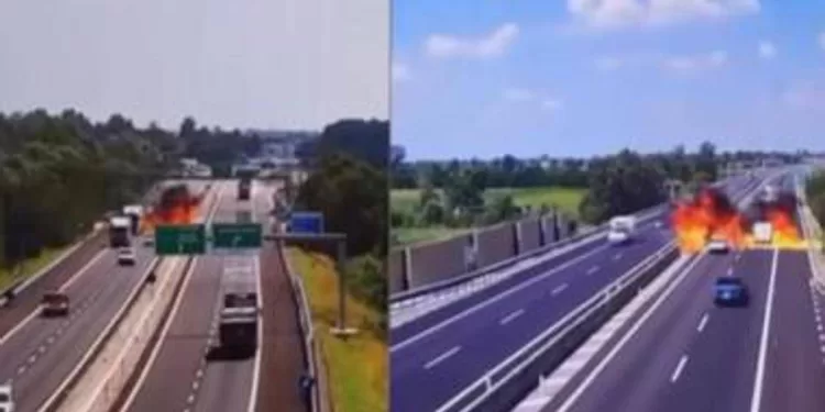 Le immagini mostrano proprio il momento in cui il velivolo cade in picchiata tra le auto che stanno transitando in quel punto in quel momento e la colonna di fumo nero che si alza dall’ultraleggero in fiamme.
