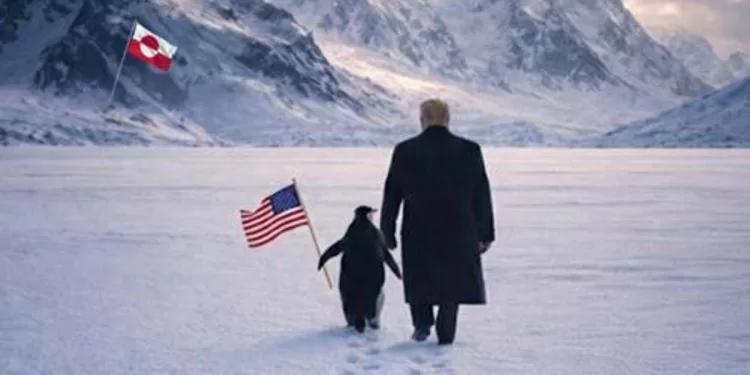 Per Trump, l’isola è fondamentale per la sicurezza nazionale degli Usa. Sui profili social della Casa Bianca ecco l’ennesima immagine generata con l’IA. Trump, sul suolo innevato della Groenlandia, cammina con un pinguino che procede tenendo la bandiera degli Stati Uniti.